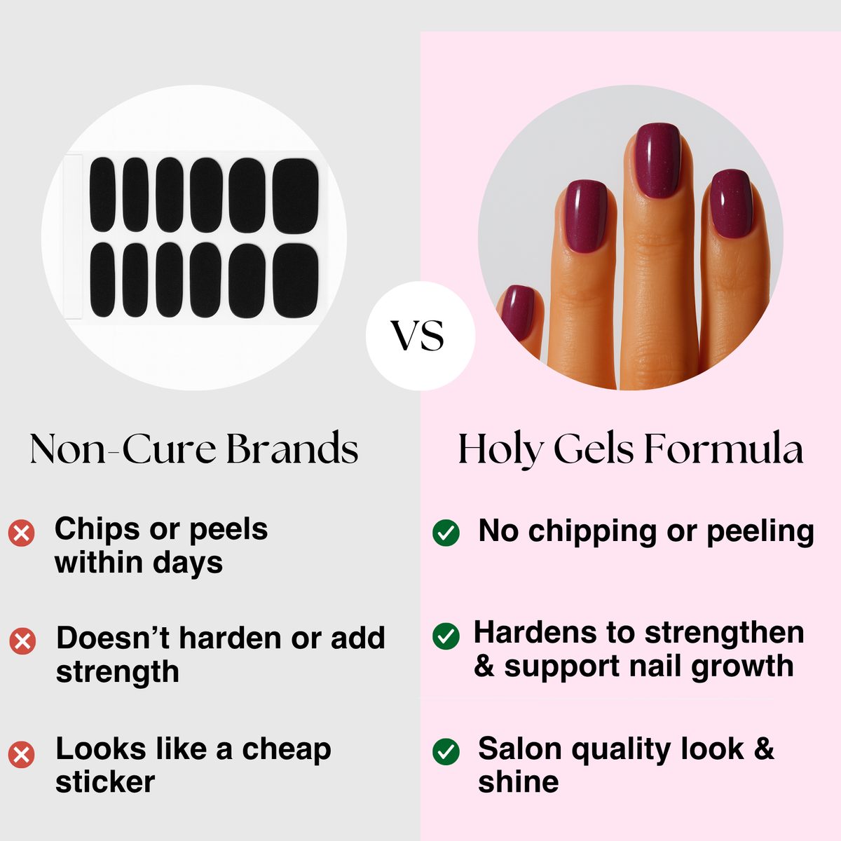 Holy Gels go on in under 10 minutes and last up to three weeks with no lifting, chipping, or dulling — effortless beauty that fits your schedule.